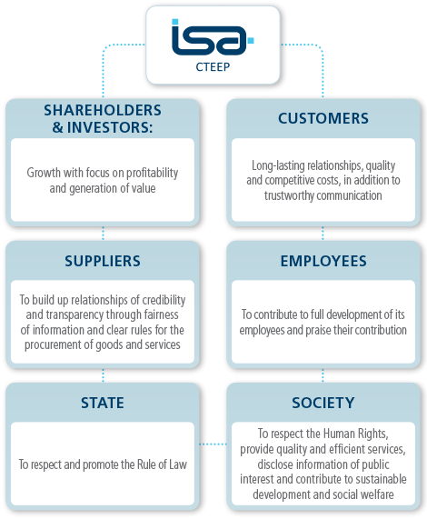 Employees, government, clients, shareholders and investors, suppliers and society are the stakeholders with which the Company keeps relationships. The engagement with such stakeholders is made possible by means of the availability of communication channels and assistance, research development, participation in public hearings and events, disclosure of results and corporate social responsibility projects, thus strengthening its guidelines towards a strategic performance, involving long-term projects and initiatives.