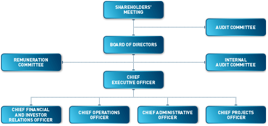 The corporate governance structure adopted by CTEEP includes a Board of Directors, an Audit Committee, as well as a Remuneration Committee and an Internal Audit Committee, as shown in the organization chart below.